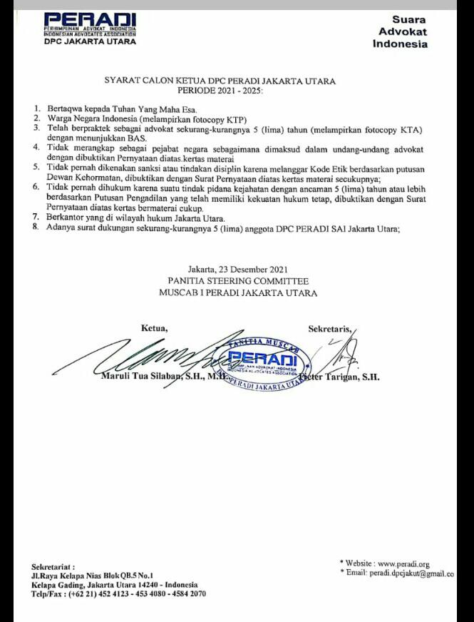 “Persyaratan itu harus dipenuhi oleh semua calon yang maju pada pemilihan Ketua Peradi Jakarta Utara periode 2021-2025 yang akan dilaksanakan pada Selasa 28 Desember 2021 di Hotel Ibis Jalan Gaya Motor Nomor 1 Sunter, Jakarta Utara,” tandas Maruli.