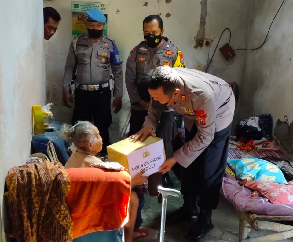 Kapolsek Pagu AKP Agus Sudarjanto, S.H. ditemani oleh Ps. Kanit Binmas Aiptu Pujo Mulyono (Bhabinkamtibmas) dan beberapa anggota lainnya membagikan paket sembako kepada 5 warga desa yang membutuhkan, yaitu Darmini (64), Kamirah (71), Samiati (64), Koderi (59), dan Ali (71).