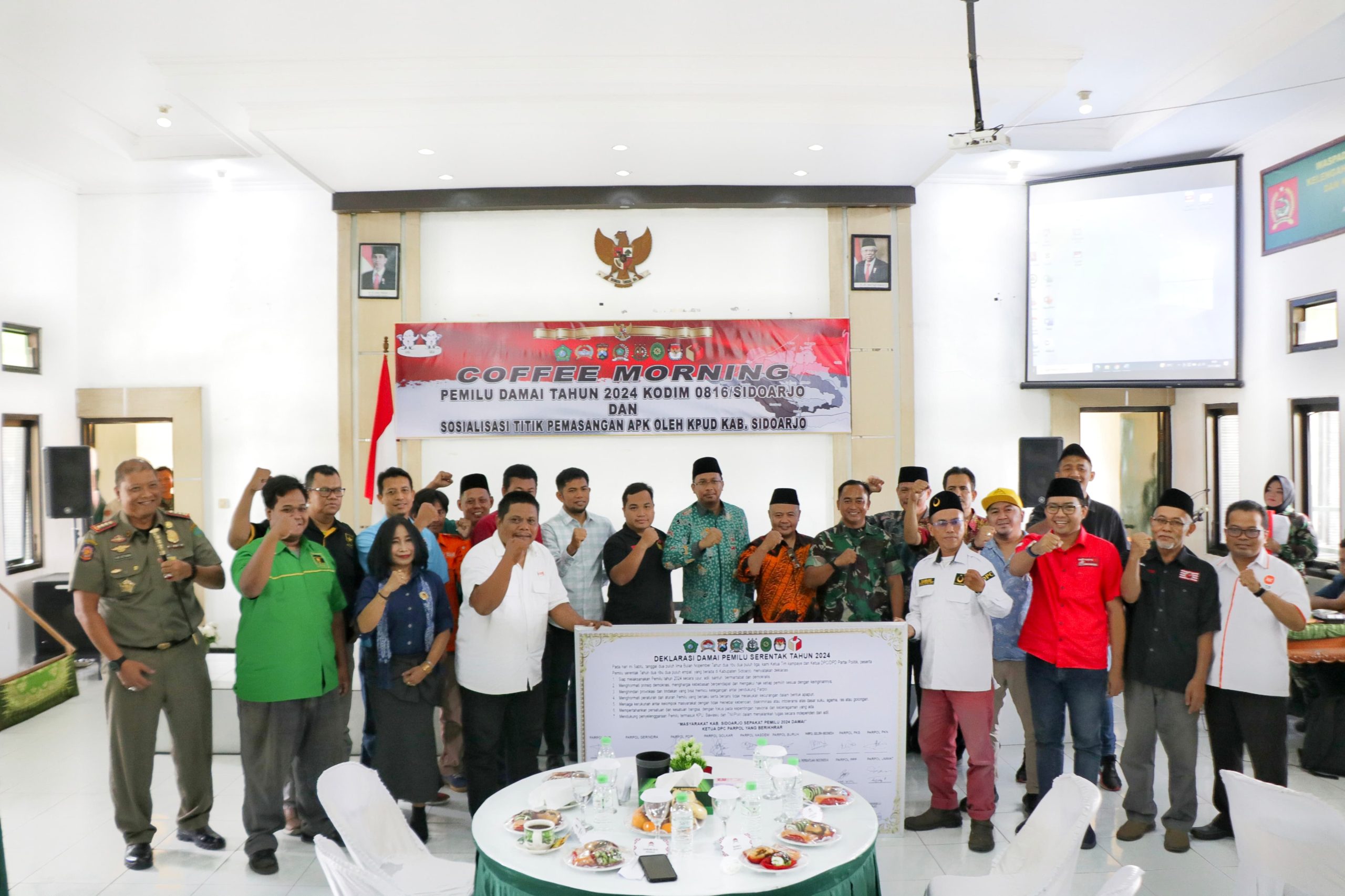 AKURATMEDIANEWS,Sidoarjo – Kodim 0816/Sidoarjo bersama KPUD Kab. Sidoarjo menggelar acara Deklarasi Pemilu Damai Tahun 2024, Sabtu (25/11/2023). Yang dikemas dalam coffee Morning sebagai bentuk dukungan dan keterlibatan aktif dalam mendukung pelaksanaan Pemilihan Umum (Pemilu) yang aman dan damai di wilayah Kabupaten Sidoarjo.