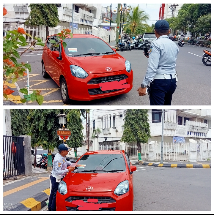 Penertiban dilakukan petugas Dishub dengan menempelkan stiker pelanggaran pada kendaraan.