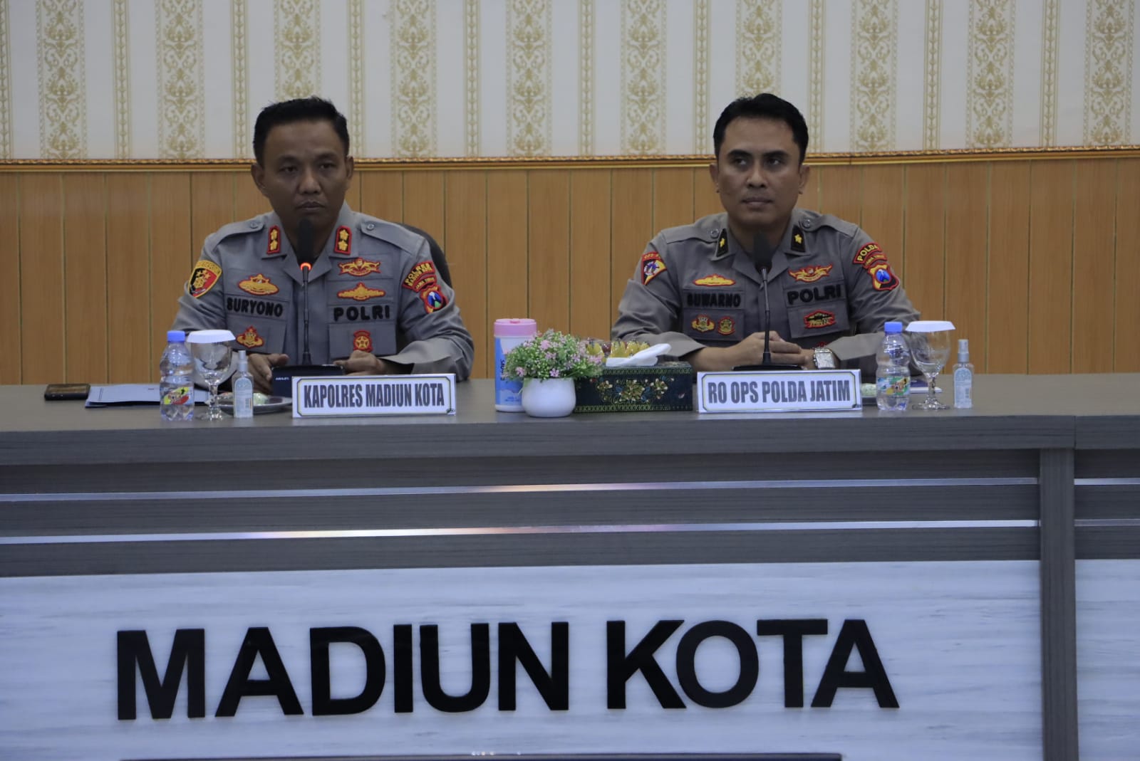 KOTA MADIUN – Akuratmedianews.com Bertempat di Gedung Sunaryo Polres Madiun Kota berlangsung rapat kordinasi (rakor) pengamanan konser musik Denny Caknan, dipimpin Kapolres Madiun Kota AKBP Suryono, SH., SIK., MH. mengundang stake holder terkait, adapun yang hadir dalam rakor tersebut dari Kodim 0803 Madiun, Denpom V/1 Madiun, Yonif PR 501 BJ, Yon Ko 463 Kopasgat, Dishub, Satpol PP, Dinkes dan EO Show Nation, serta hadir juga dari Ro Ops Polda Jatim Kompol Suwarno, Kamis (12/1/2023).