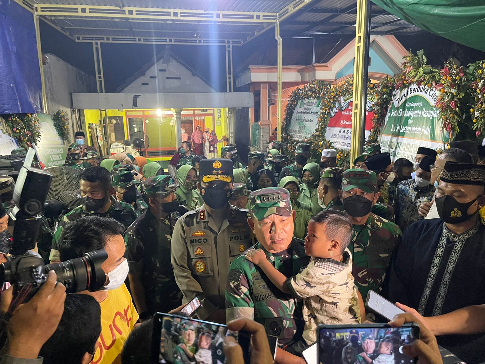 SURABAYA Akurat Media News – Forkopimda Jawa Timur Pangdam V/Brawijaya Mayjen TNI Nurchahyanto , Kapolda Jawa Timur Irjen Pol Nico Afinta bersama Pejabat Utama Kodam V/Brawijaya dan Pejabat Utama Polda Jatim mendampingi KASAD Jenderal TNI Dudung Abdurachman dan Istri beserta rombongan dari Mabes TNI AD, melakukan ziarah makam dan takziyah di rumah korban aksi penyerangan Kelompok Kriminal Bersenjata (KKB) di Dusun Sawo, Desa Sukodono, Kabupaten Sidoarjo, serta membesuk anaknya yang sedang dirawat di RSUD Dr Soetomo Surabaya, pada Senin (4/4/2022).