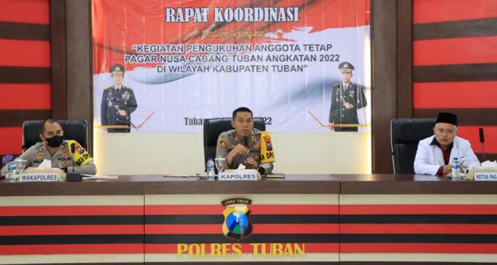 Rakor dilaksanakan di Polres Tuban Kamis (11/08/2022) yang dimpimpin langsung Kapolres Tuban AKBP Rahman Wijaya, S.I.K., S.H., M.H. hadir juga Wakapolres Tuban Kompol Palma Fitria Fahlevi, S.I.P., S.I.K. M.I.K., PJU Polres Tuban, Ketua Pagar Nusa Cabang Tuban M. Abdul Mujib, stakeholder terkait serta Kapolsek jajaran.
