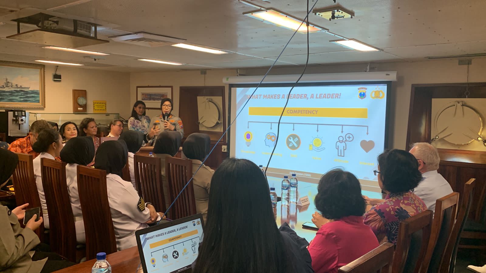 Bertempat di dalam kapal perang Australia HMAS ANZAC/FH 150 yang tengah bersandar di Dermaga Jamrud Utara, AKBP Herlina menyampaikan mengenai peran kepemimpinan perempuan dalam institusi Polri.