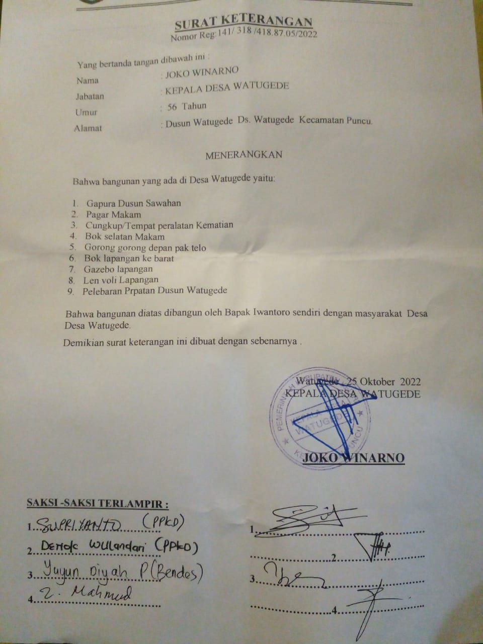 ” Benar itu donatur dari Pak Iwan, saya berani (membuat surat keterangan) karena ada saksinya, kalau dari dana desa kan ada TPK yang melaksanakan dari TPK tapi hal ini Pak Iwan sendiri tidak menggunakan TPK,” kata Joko Winarno.