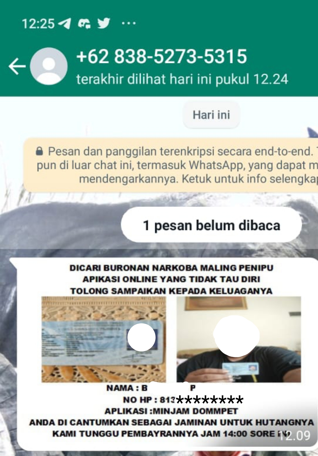 “Siang tadi saya dapat Whatsaap dari nomor tak dikenal, nomor hp tersebut mengirim foto bergambar rekan saya, dengan tulisan buronan narkoba serta terlibat Pinjaman Online,” kata RA salah satu jurnalis TV yang menerima pesan tersebut.