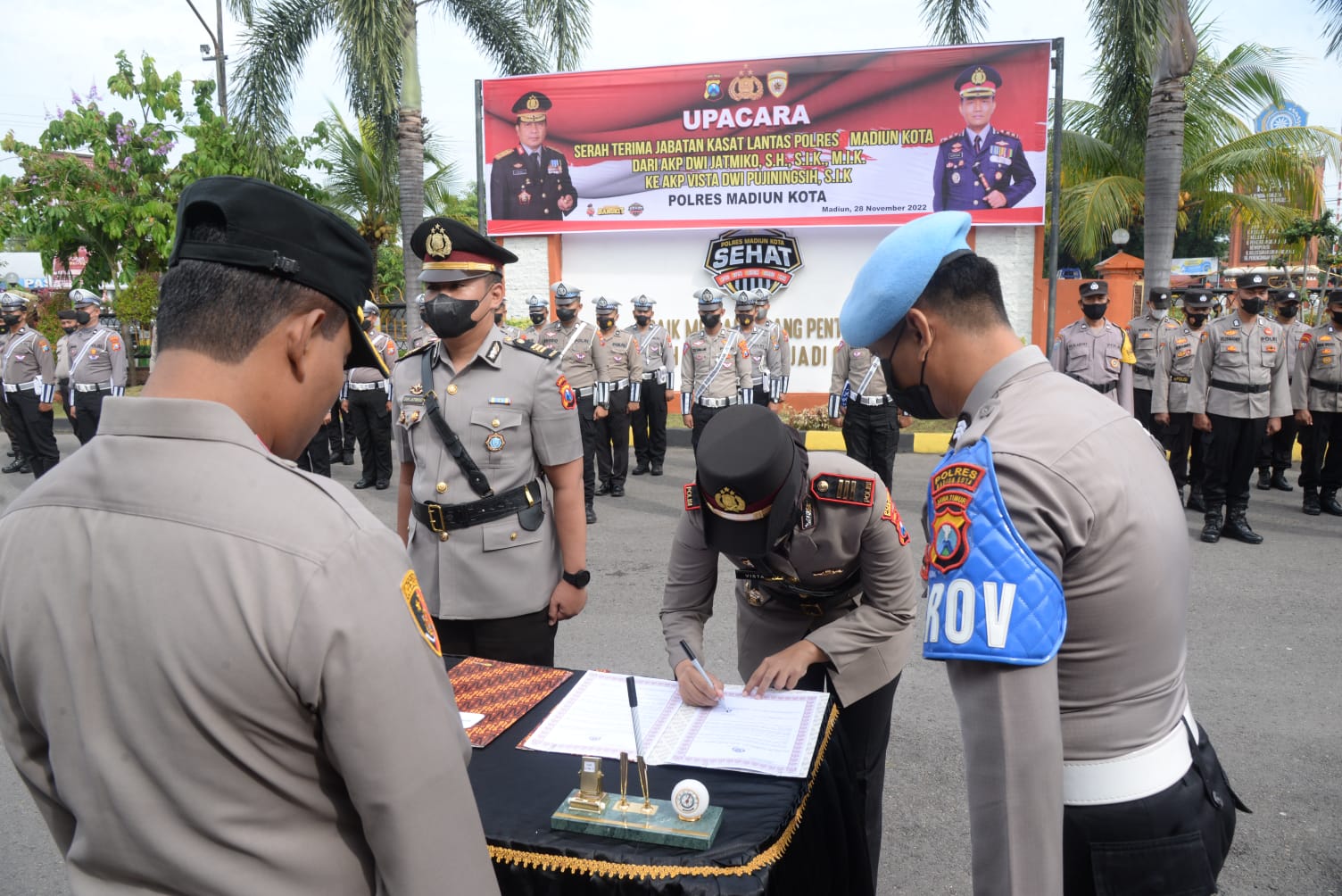 Adapun pejabat Polres Madiun Kota yang dikukuhkan yakni Kasat Lantas diserah terimakan dari AKP Dwi Jatmiko, S.H., S.I.K., M.I.K. kepada AKP Vista Dwi Pujiningsih, S.I.K. yang sebelumnya menjabat Kasubbag Binkar Polres Madiun Kota Polda Jatim.