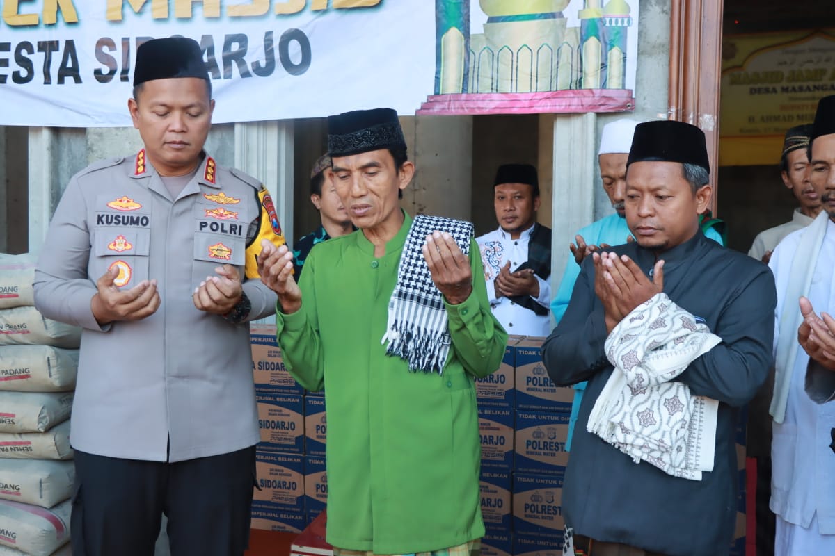 Pada kesempatan ini, Kapolresta Sidoarjo juga menyerahkan bantuan bahan bangunan, Al Qur’an dan air mineral ke takmir Masjid Jami’ Al Hasan yang sedang melakukan proses pembangunan masjid.