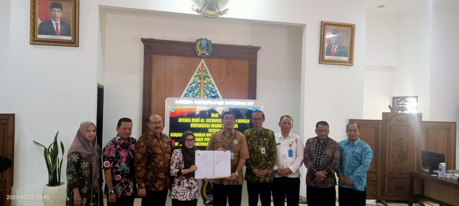 MAGETANAkuratmedianews.com Kerja keras Rumah Sakit Umum Daerah ( RSUD) Dr. Sayidiman Magetan berbuah manis. Hari telah ditandatangani nota kesepahaman ( MOU) antara Fakultas Kedokteran Unesa Surabaya dengan RSUD Sayidiman Magetan di Ruang Jamuan Pendopo Surya Graha Kamis (23/2/2023).Isi dari MOU tersebut adalah kerjasama dalam hal ini RSUD Sayidiman dijadikan sekolah pendidikan Satelit oleh FK Unesa.