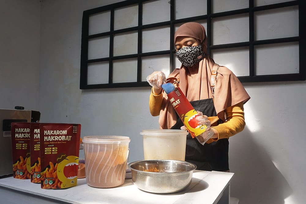 Akurat Media News Kediri Kota — Beragam camilan kini banyak hadir di sekitar kita, terutama makaroni pedas. Makrobat, Makan Makaroni Karo Tobat, produk makaroni pedas asli Kota Kediri hadir meramaikan camilan di pasaran. Camilan bermaskot kuning dengan kemasan khas warna merah ini telah melewati uji coba, survei pasar, dan minta saran orang terdekat pemilik sudah dilakukan agar produk sesuai dengan harapan, “karena aku juga memposisikan diri sebagai konsumen untuk menilai produkku apakah sudah pas untuk dijual,” ujar Raiza Rafika Sari, 27, pemilik Makrobat. Dengan kemasan pouch ukuran berat 100gram, Ia hanya membanderol 10.000 rupiah saja.