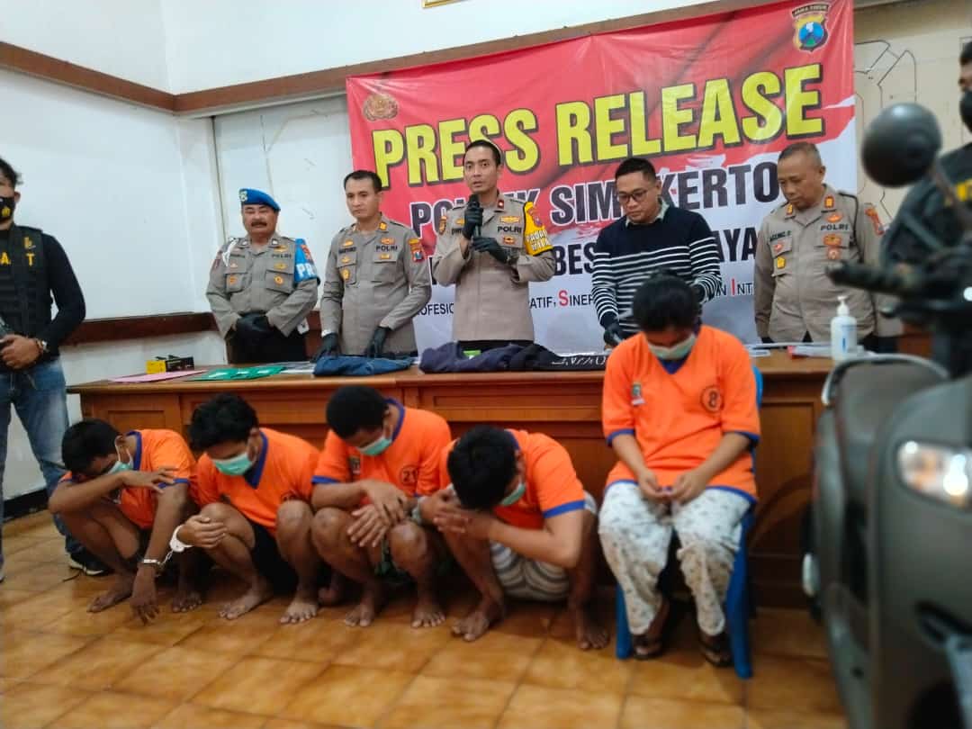 ST dan suaminya dihadirkan dalam kegiatan Konferensi Pers di Mapolsek Simokerto bersama 3 orang kawanan pencurian kendaraan bermotor yang ditetapkan sebagai tersangka.