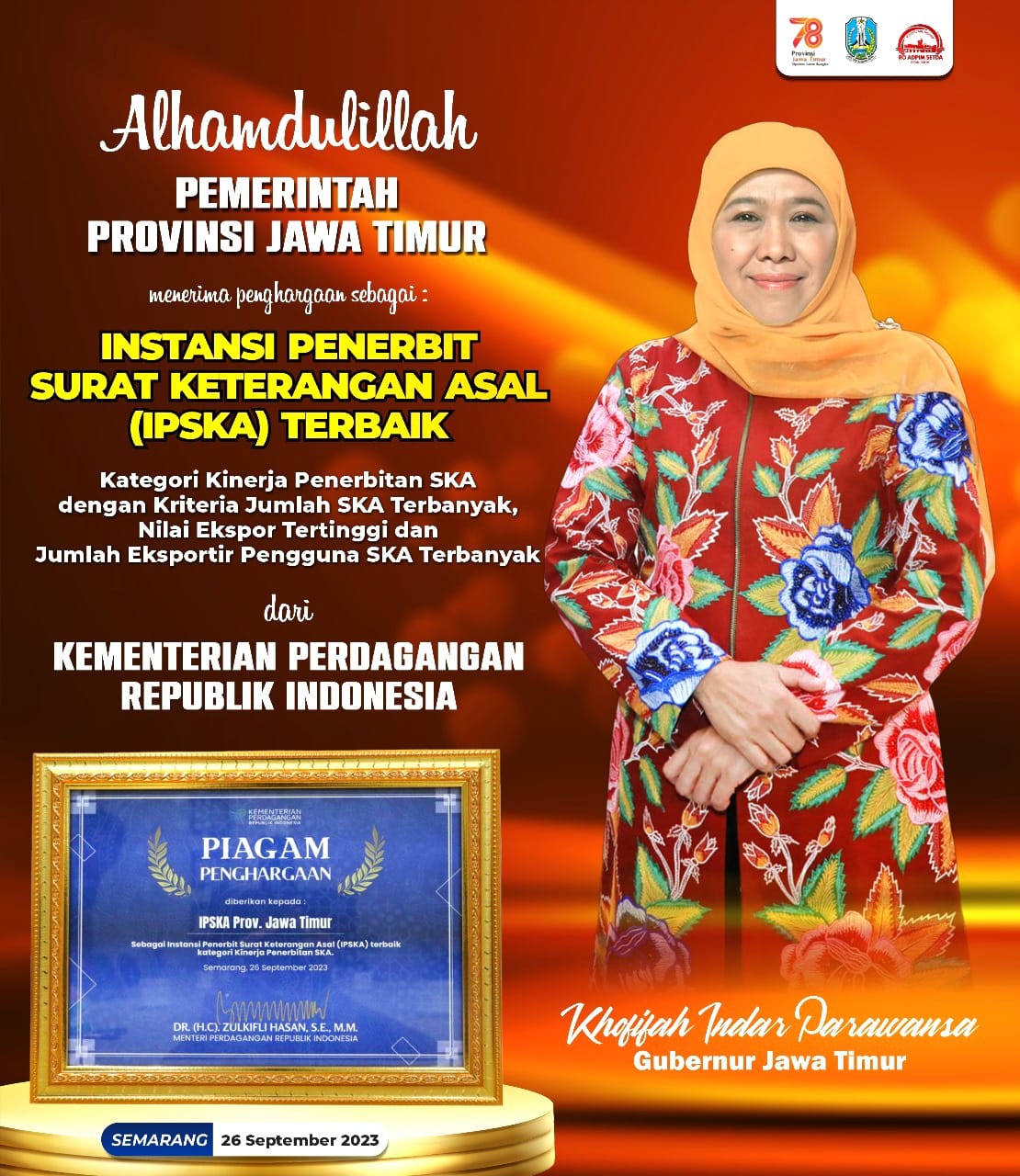 Penghargaan tersebut diserahkan oleh Menteri Perdagangan RI Zulkifli Hasan kepada Gubernur Jawa Timur Khofifah Indar Parawansa yang diwakili Kepala Dinas Perindustrian dan Perdagangan Jatim Iwan dalam gelaran Rapat Koordinasi IPSKA di Semarang, Jawa Tengah pada Selasa (26/9) pagi.