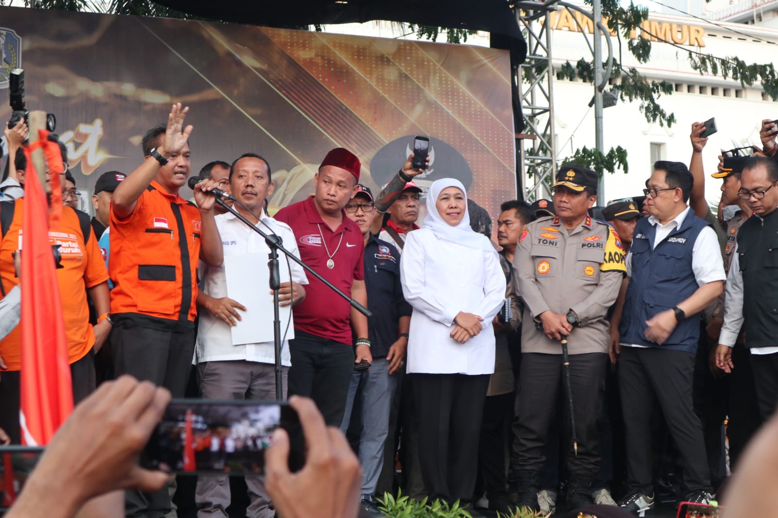 Dalam aksi tersebut, masa dari ribuan buruh ditemui oleh Gubernur Jawa Timur Khofifah Indar Parawansa didampingi oleh Kapolda Jatim Irjen Pol.Dr. Toni Harmanto,M.H.