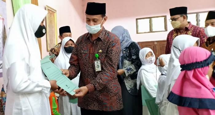 Kepala Kemenag Ahmad Munir, didampingi para Kasi memberikan santunan langsung kepada anak yatim. Pria asal kota Ledre ini menyatakan kegembiraannya bisa berbagi dengan anak yatim.
