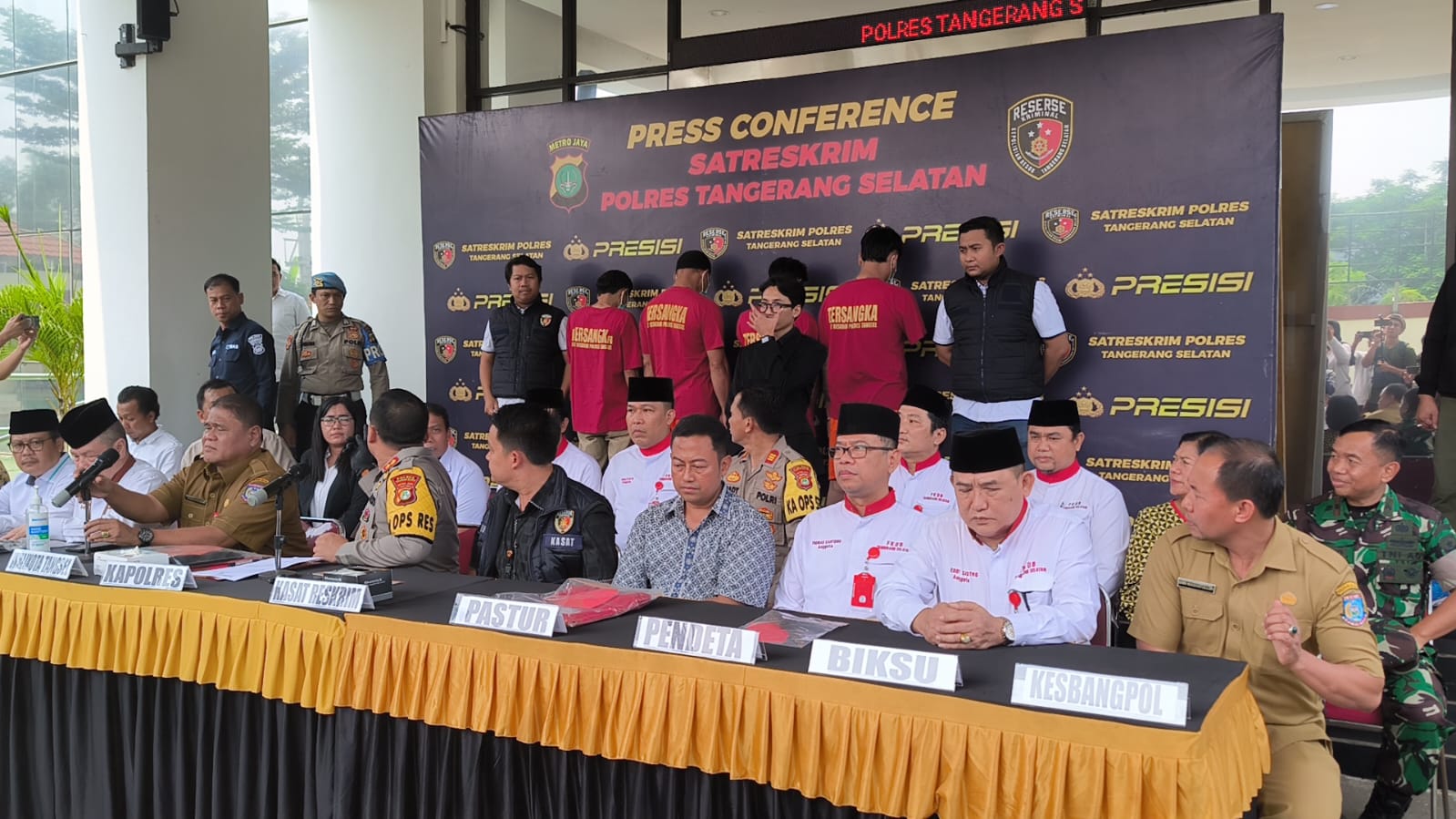 Lanjutnya, dalam konferensi Pers, terlihat jelas bahwa Polres Tangerang Selatan (Tangsel) beserta tokoh agama dan lainnya sedang melaporkan hasil penagkapan dan penahanan empat orang yang diduga terlibat dalam penganiayaan atau pemukulan terhadap mahasiswa Unpam yang sedang melakukan Doa Rosario di Indekos setempat.
