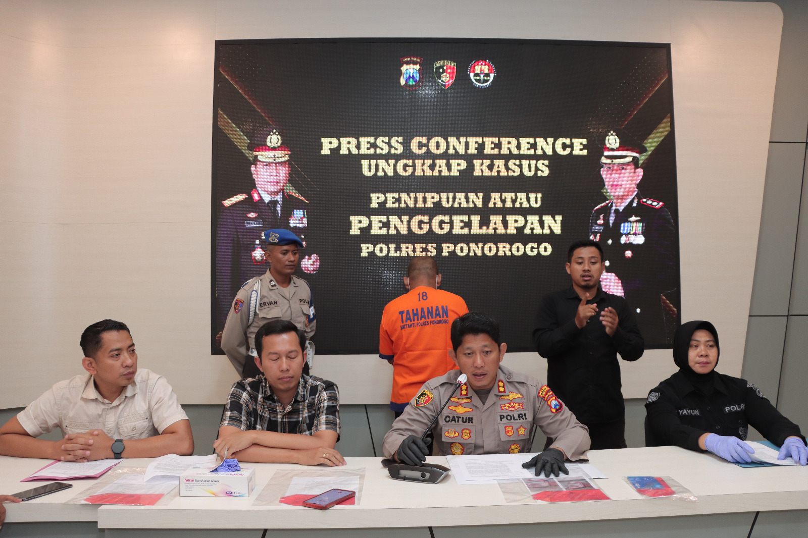 Kapolres Ponorogo AKBP Catur C. Wibowo, S.I.K., M.H. menyampaikan bahwa tersangka yang berinisial EN warga Kecamatan Sampung Kabupaten Ponorogo melakukan penipuan atau Penggelapan terkait jual beli kendraan roda empat jenis Truk.