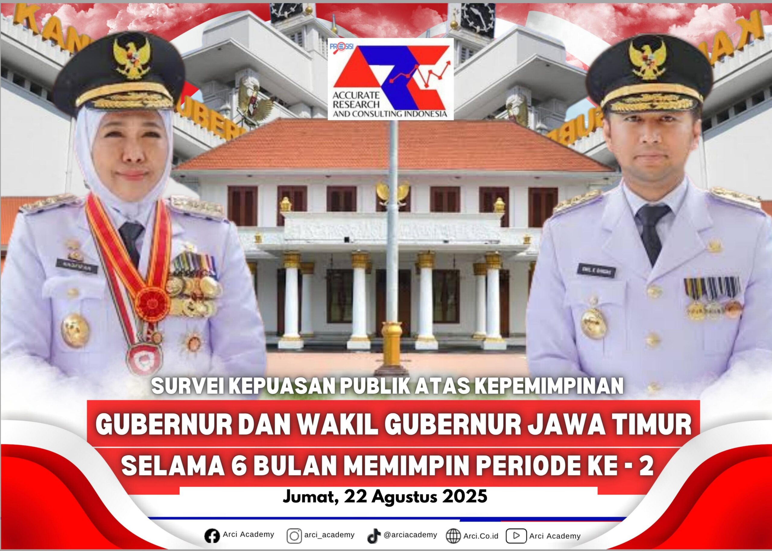Akuratmedianews.com – Accurate Research and Consulting Indonesia (ARCI) merilis hasil survei kepuasan warga Jawa Timur terhadap kinerja Gubernur Khofifah Indar Parawansa dan Wakil Gubernur Emil Elestianto Dardak. Hasilnya, kepuasan warga Jatim terhadap kinerja Khofifah-Emil meningkat.