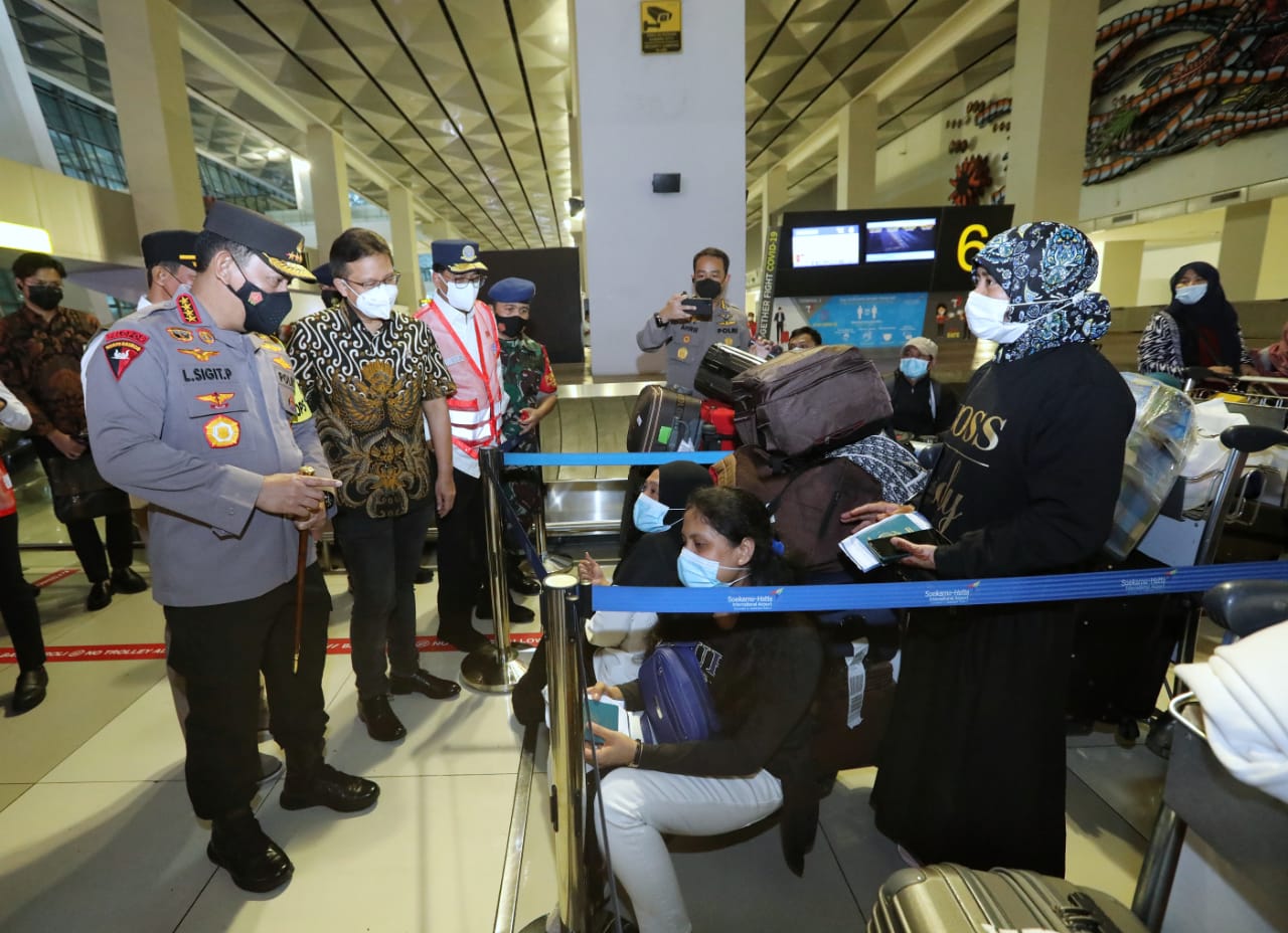 “Baru saja kami melaksanakan pengecekan secara langsung untuk mengetahui proses pemeriksaan terkait dengan kedatangan saudara-saudara kita pelaku perjalanan internasional. Secara umum kita lihat ada 14 tahapan yang harus dilalui. Mulai saat masuk kemudian dilaksanakan pemeriksaan awal sampai dengan tahap terakhir diarahkan menuju hotel atau wisma untuk melaksanakan karantina,” kata Sigit usai mengecek langsung di Bandara Soetta.