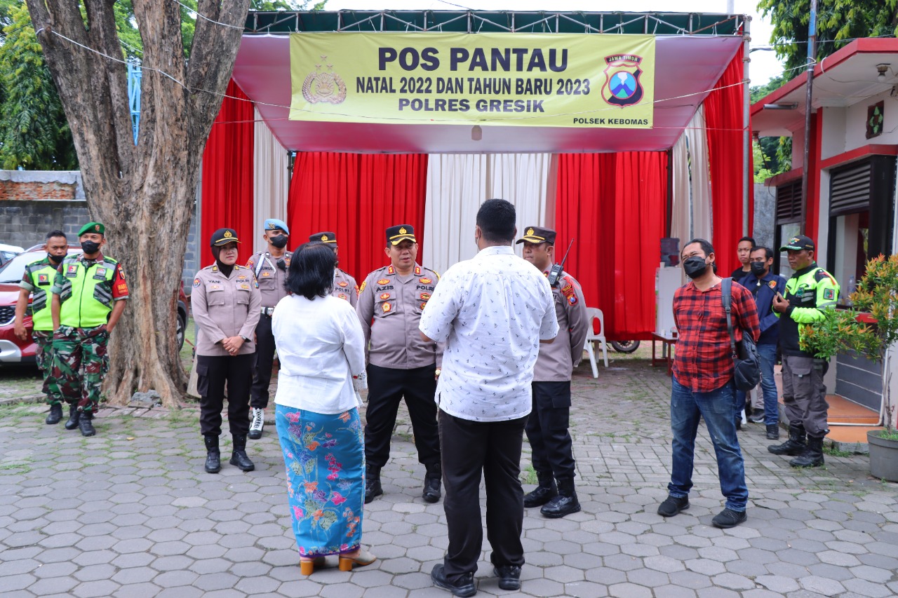 GRESIK, Akurat media news.com – Kapolres Gresik AKBP Mochamad Nur Azis didampingi Kabag Ops Polres Gresik Kompol Kompol Andria Diana Putra melakukan pengecekan langsung ke lokasi pengamanan gereja ibadah Natal 2022.