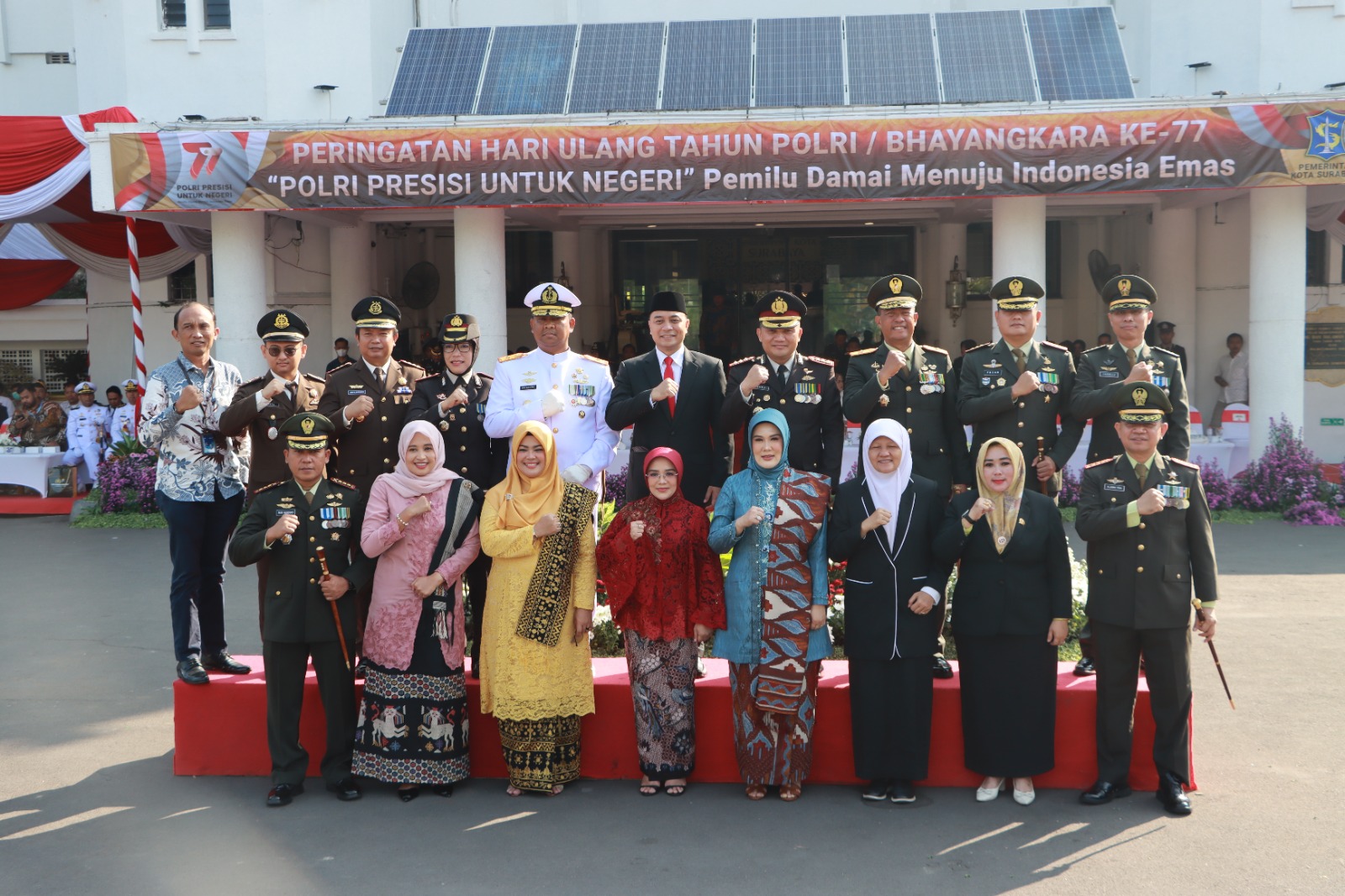 Turut hadir dalam pelaksanaan upacara HUT Bhayangkara ke-77 di halaman Balai Kota Surabaya, Wali Kota Surabaya, Ketua DPRD Surabaya, Kajari Surabaya, Danrem Bhaskarajaya, Dandim Utara, Dandim Selatan, Dandim Timur dan ketua Pengadilan Negeri Kota Surabaya.