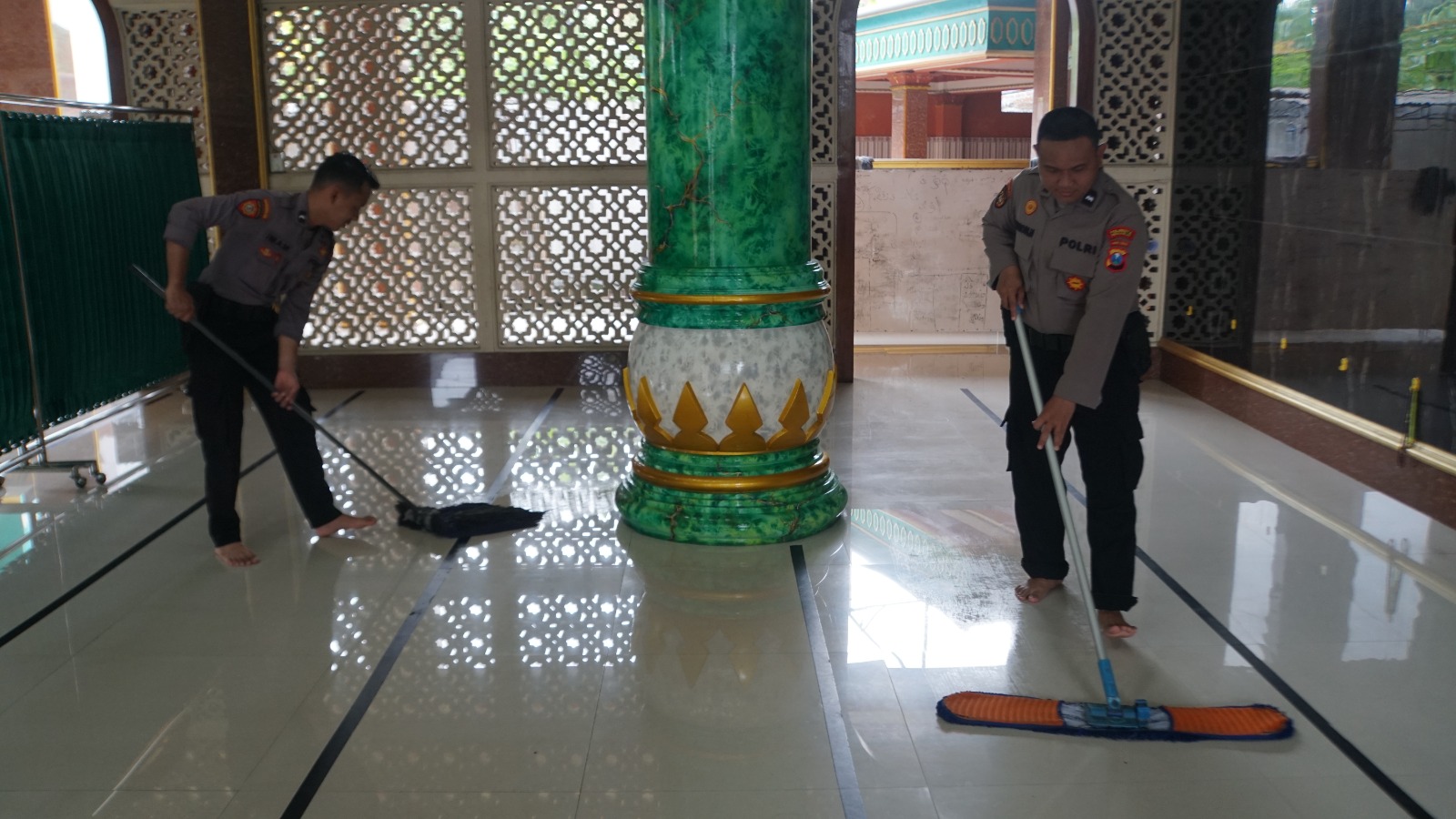 Seperti berlangsung di Masjid Sabilul Mutaqin, Cemengkalang, Sidoarjo. Anggota Samapta Polresta Sidoarjo melaksanakan bersih-bersih halaman dan bagian dalam masjid tersebut.