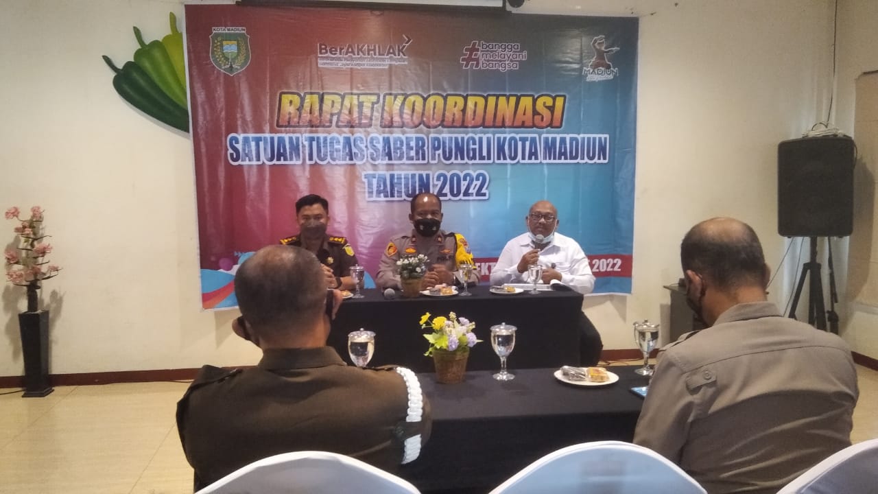 KOTAMADIUN, -akuratmedianews.com- Wakapolres Madiun Kota Kompol Supriyono bersama Satgas lakukan Rapat Kordinasi Satgas Sapu Bersih Pungutan Liar (Saber Pungli) Kota Madiun yang bertempat di Aula Salah satu rumah Makan di Kota Madiun. Rabu (30/3/2022).